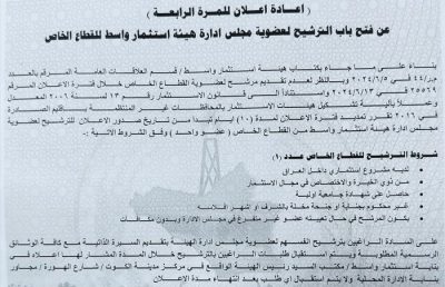 اعادة اعلان للمرة لرابعة صادر من ديوان محافظة واسط عن فتح باب الترشيح لعضوية مجلس ادارة هيئة استثمار واسط-للقطاع الخاص.