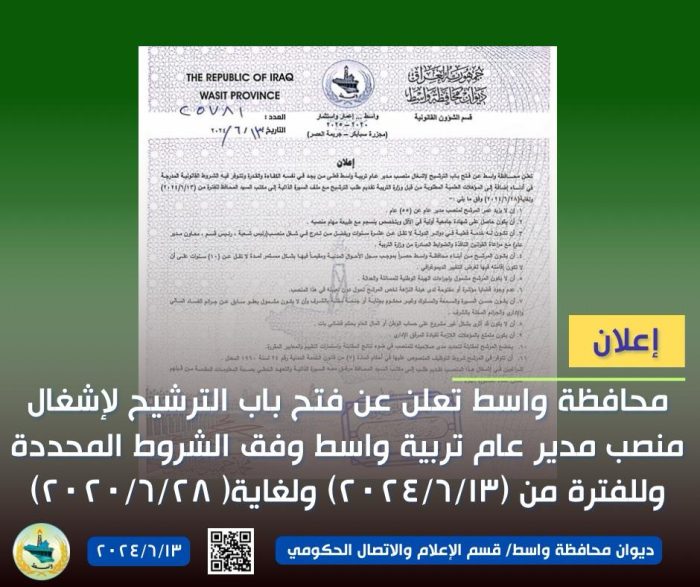 تعلن محافظة واسط عن فتح باب الترشيح لإشغال منصب مدير عام تربية واسط فعلى من يجد في نفسه الكفاءة والقدرة وتتوفر فيه الشروط القانونية المدرجة