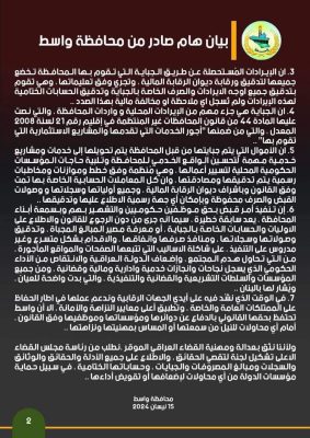 7. في الوقت الذي نشُد فيه على أيدي الجهات الرقابية وندعم عملها في اطار الحفاظ على الممتلكات العامة والخاصة ، وتطبيق أعلى معايير النزاهة والأمانة ، الا أن واسط تحتفظ بحقها القانوني بالدفاع عن دوائرها ومؤسساتها وموظفيها وفق القانون ، أمام أي محاولات للنيل من سمعتها أو المساس بمهنيتها ونزاهتها ..