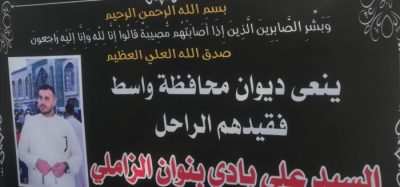 مجلس عزاء ترحماً على روح الموظف في قسم شؤون المواطنين السيد علي بادي الزاملي وروح والده وعمه “رحمهم الله” الذين وافتهم المنية اثر حادث مؤسف، حضره السيد المحافظ والنائب كريم الشاعر ونائبي المحافظ ومعاونيه ومستشاريه ومديري اقسام وموظفي المحافظة وعدداً من ممثلي الدوائر والموسسات ،وبمشاركة ذوي المتوفين وأقاربهم وأصدقائهم ومحبيهم .