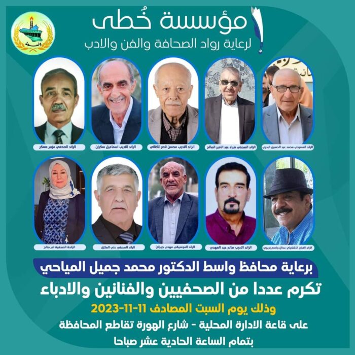 برعاية محافظ واسط د. محمد جميل المياحي ،اقامت مؤسسة خُطى لرعاية رواد الصحافة والفن والأدب، اليوم السبت الموافق 11/ 11/ 2023 الحفل التكريمي العاشر لنخبة من رواد محافظة واسط، حمل اسم الفنانة الرائدة الراحلة أمل طه، وعلى قاعة الادارة المحلية في الكوت .