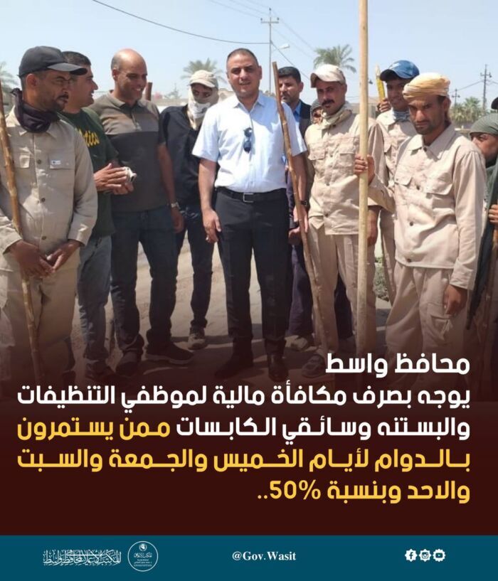 يوجه بصرف مكافأة مالية لموظفي التنظيفات والبستنه وسائقي الكابسات ممن يستمرون بالدوام لأيام الخميس والجمعة والسبت والاحد وبنسبة 50%..