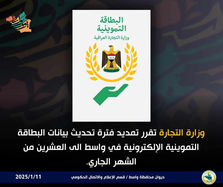 قررت وزارة التجارة تمديد فترة تحديث البيانات للمواطنين في محافظة واسط لغاية ٢٠٢٥/١/٢٠ استجابة للمناشدات الكثيرة من قبل اهالي محافظة واسط بهذا الخصوص ، وتنوه بأن الافراد الذين لم يدخلوا على نظام التسجيل والتحديث لغاية ٢٠٢٥/١/٢٠ سيتم حجب حصصهم التموينية .