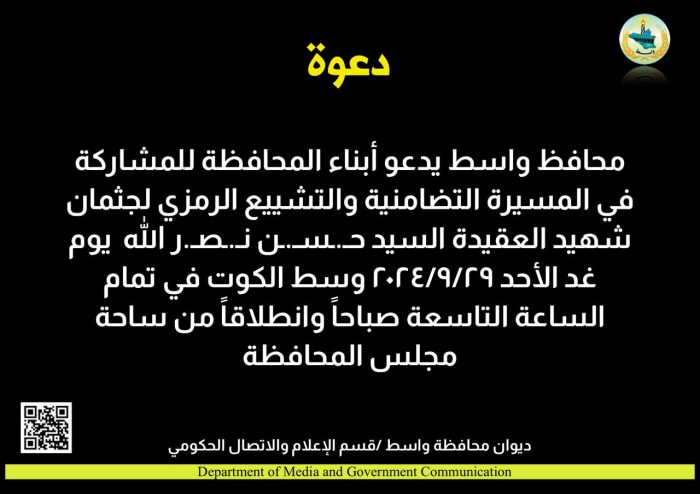 وجه السيد محافظ واسط نداءً الى أبناء محافظ واسط بتنظيم مسيرة حزن وتضامن وتشييع رمزي غداً الاحد التاسعة صباحاً تنطلق من ساحة مجلس المحافظة وتطوف مركز المدينة، إكراماً ووفاءً للشهيد القائد” نـ.ـصـ.ر الله ” ونصرة للشعب اللبناني الشقي