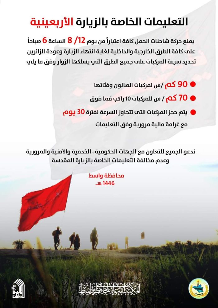 مع بداية توافد الزائرين الاجانب عبر منفذ زرباطية ،وايضا انطلاق مسيرة الزوار الكرام من المحافظات المجاورة ،وانطلاق اهالي محافظة واسط خلال الايام الاتية لأداء الزيارة أو لتقديم الخدمة ،ولأجل الحفاظ على ارواح وسلامة الزائرين ، ولانسيابية ولتسهيل مرور ومسير الزوار والمواكب وللحد من الحوادث المرورية وغيرها :