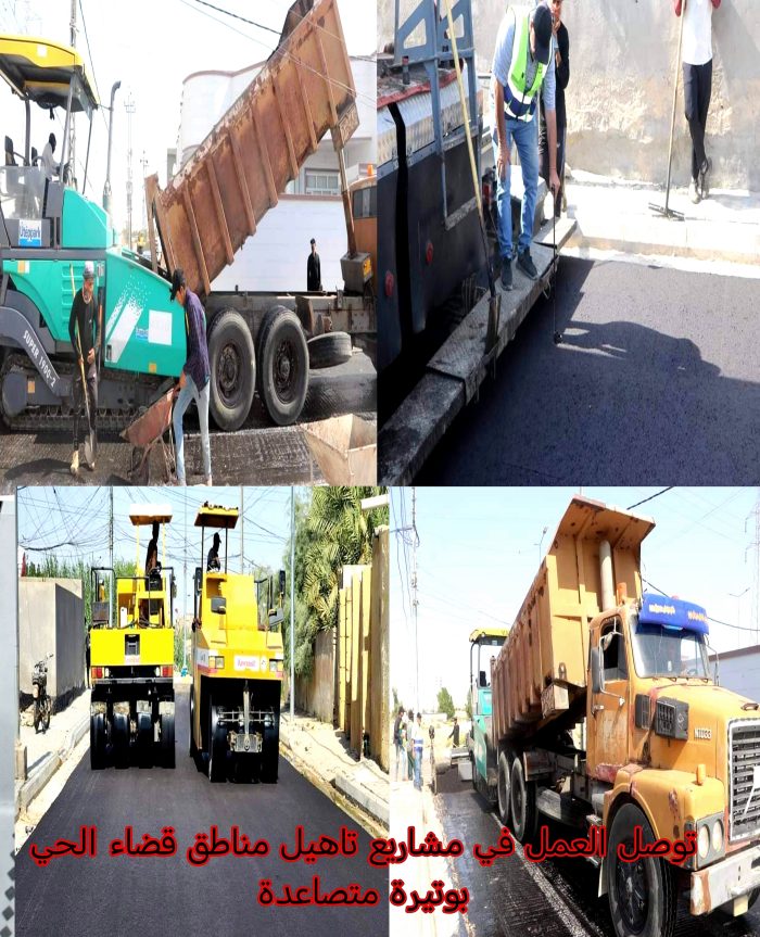 حيث جرت المباشرة في تنفيذ مراحل الاكساء بطبقة الاسفلت النهائية لشوارع حي سعيد بن جبير ،المنفذة ضمن أعمال مشروع تأهيل وتطوير البنى التحتية لهذه المنطقة وتحقيق نسب انجاز فعلي فيه قد تجاوزت الـ91 %لتتعدى مامخطط له بنسبة89 % ،وبمراعاة تطبيق المواصفات الفنية المعدة في كشف العمل .
