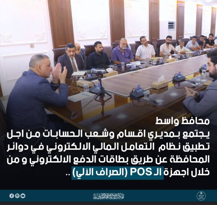 ✅️محافظ واسط يجتمع بمديري اقسام وشعب الحسابات من اجل تطبيق نظام التعامل المالي الالكتروني في دوائر المحافظة عن طريق بطاقات الدفع الالكتروني و من خلال اجهزة الـ POS (الصراف الآلي)…