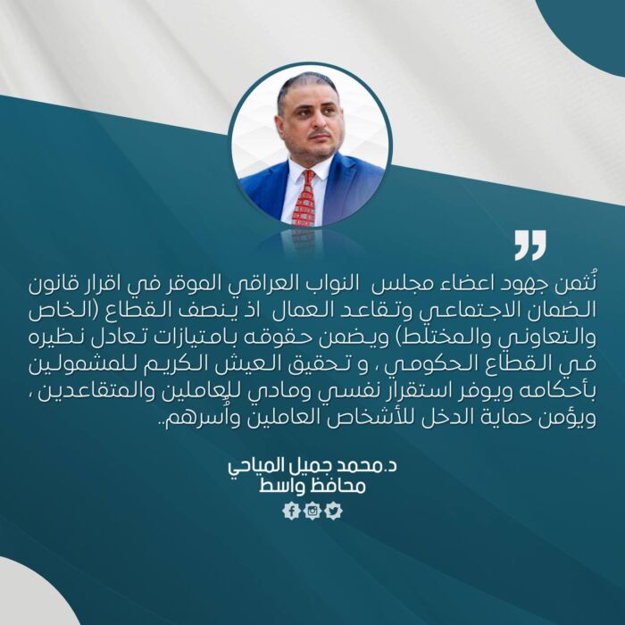 ✅️محافظ واسط يُثمن جهود اعضاء مجلس النواب العراقي الموقر في اقرار قانون الضمان الاجتماعي وتقاعد العمال اذ ينصف القطاع (الخاص والتعاوني والمختلط) ويضمن حقوقه بامتيازات تعادل نظيره في القطاع الحكومي…