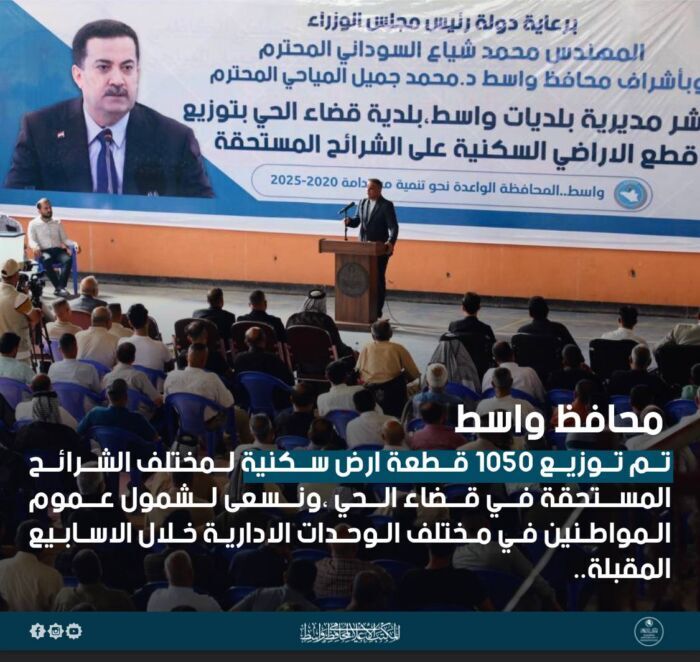 محافظ واسط تم توزيع 1050 قطعة ارض سكنية لمختلف الشرائح المستحقة في قضاء الحي