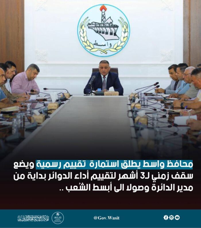 محافظ واسط يطلق استمارة تقييم رسمية ويضع سقف زمني لـ3 أشهر لتقييم أداء الدوائر بداية من مدير الدائرة وصولا الى أبسط الشُعب .. t.me/Gov_Wasit