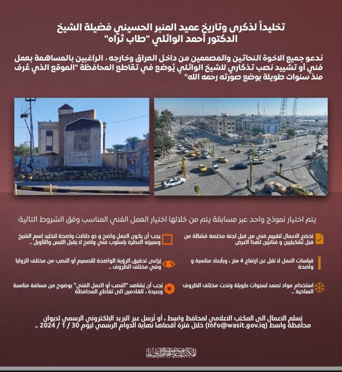 تنفيذاً لتوجيهات السيد محافظ واسط المحترموتخليداً لذكرى وتاريخ عميد المنبر الحسيني فضيلة الشيخ الدكتور أحمد الوائلي “طاب ثراه”ندعو جميع الاخوة النحاتين والمصممين من داخل العراق وخارجه ، الراغبين بالمساهمة بعمل…