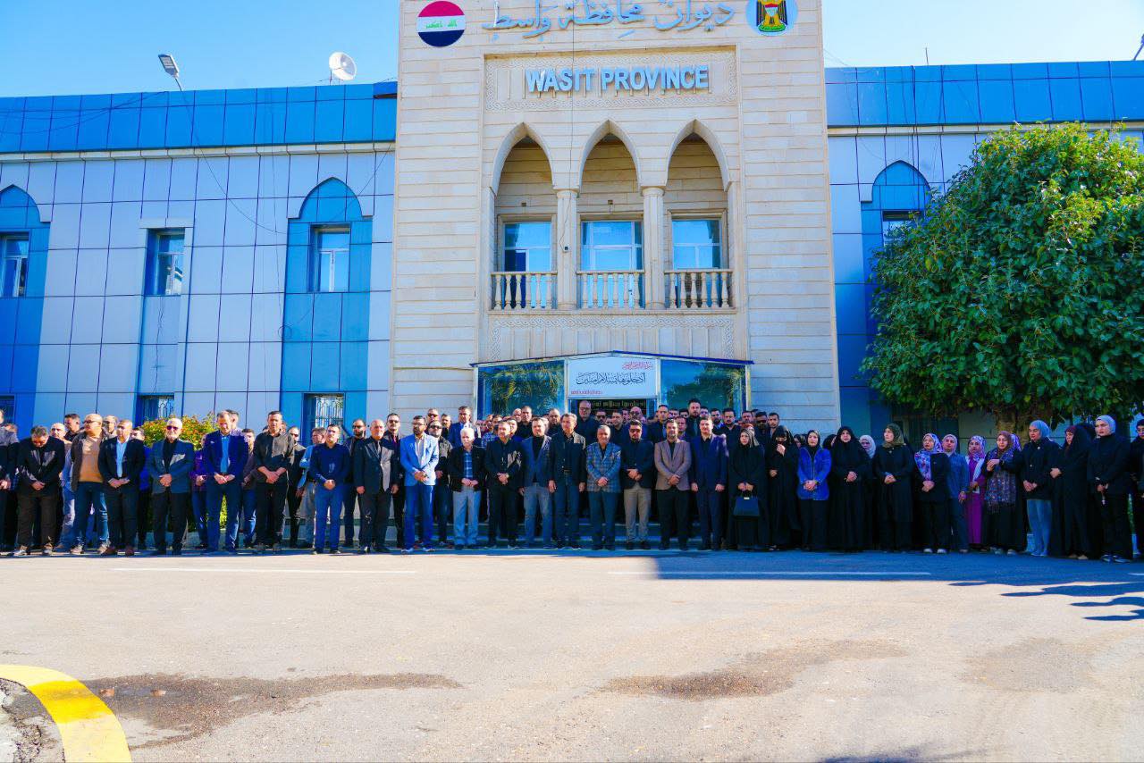نظم ديوان محافظة واسط وقفة حداد على روح سماحة السيد علي الخامنئي (قدس سره) ، بحضور السيد محافظ واسط الاستاذ هادي مجيد كزار الهماشي والنائب الفني الاستاذ عدنان الزبيدي