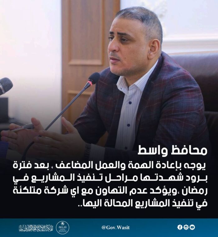 محافظ واسط يوجه بإعادة الهمة والعمل المضاعف بعد فترة برود شهدتها مراحل تنفيذ المشاريع في رمضان