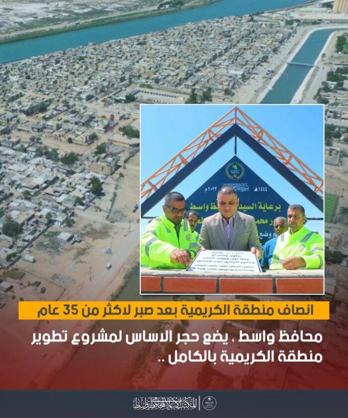 انصاف #منطقة_الكريمية بعد صبر لاكثر من 35 عام محافظ واسط يضع حجر الاساس لمشروع تطوير منطقة الكريمية بالكامل ..