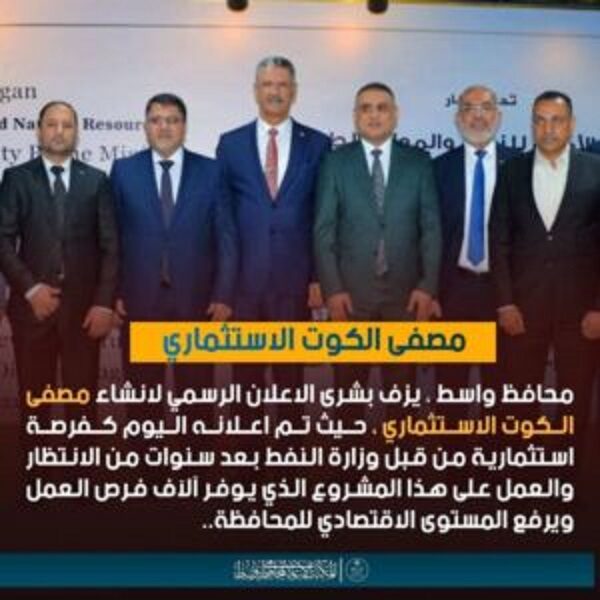 محافظ واسط يزف بشرى الاعلان الرسمي لانشاء مصفى الكوت الاستثماري