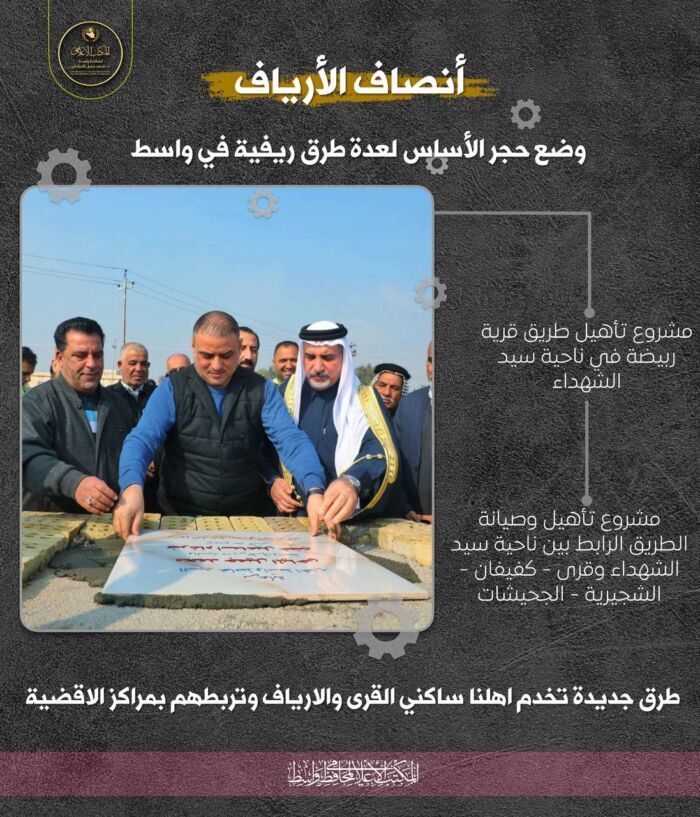 افتتح محافظ واسط د. محمد جميل المياحي عدد من الطرق التي تخدم اهالي ارياف في قضاء الحي..