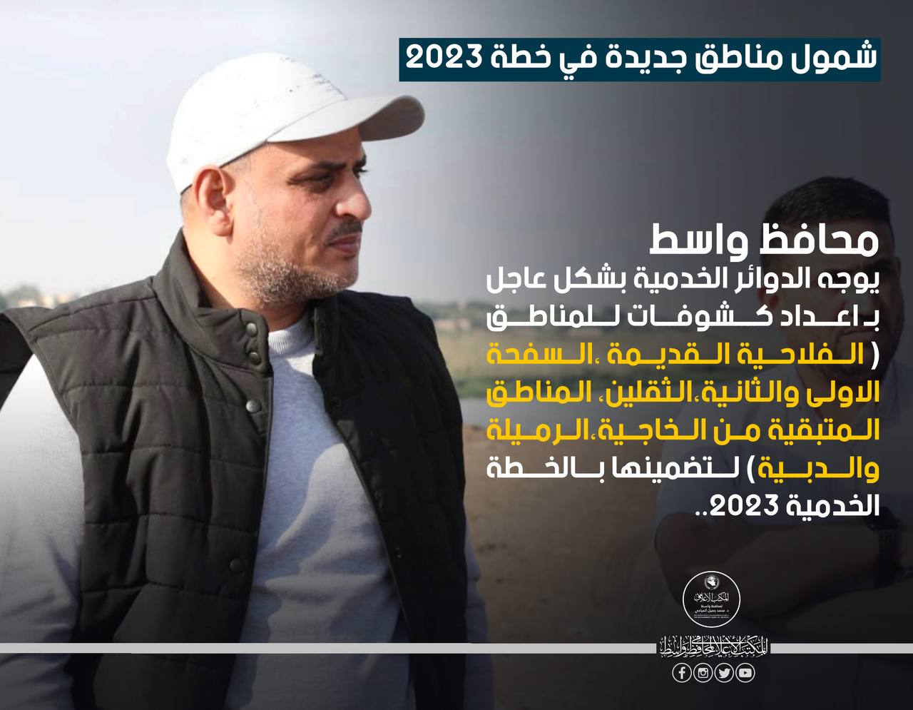 وجه محافظ واسط د. محمد جميل المياحي الدوائر الخدمية بشكل عاجل بـ اعداد كشوفات للمناطق ( الفلاحية القديمة ، السفحة الاولى والثانية ، الثقلين ، المناطق المتبقية من الخاجية ،…
