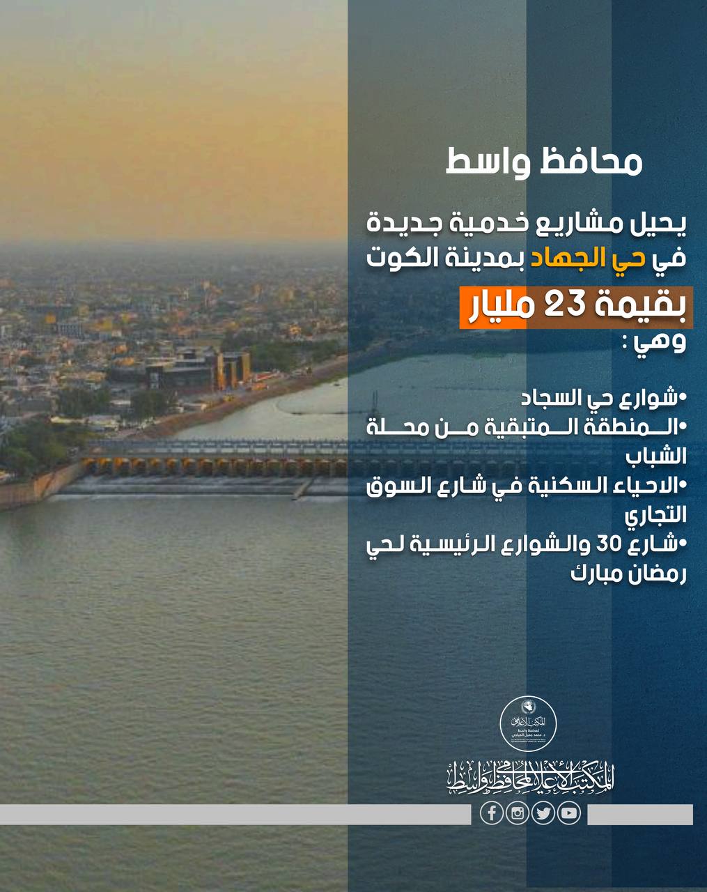 محافظ واسط د. محمد جميل المياحي يحيل مشاريع خدمية جديدة في حي الجهاد بمدينة الكوت بقيمة 23 مليار وهي : •شوارع حي السجاد. •المنطقة المتبقية من محلة الشباب. •الاحياء السكنية…