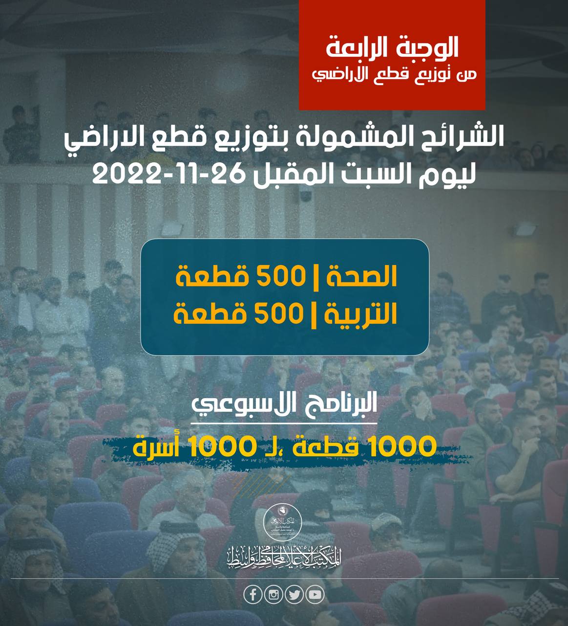 مع استمرار البرنامج الاسبوعي 1000قطعة لـ1000 أسرة كانت الشرائح المشمولة بتوزيع قطع الاراضي ليوم السبت 26-11-2022 هي الصحة والتربية وبواقع 500 قطعة لكل شريحة.. ضمن البرنامج الاسبوعي 1000قطعة ، لـ1000…