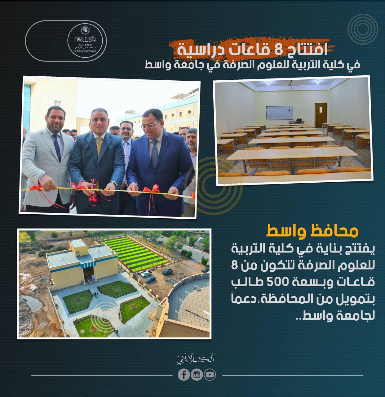 افتتح محافظ واسط د. محمد جميل المياحي بناية في كلية التربية للعلوم الصرفة تتكون من 8 قاعات و بسعة 500 طالب بتمويل من المحافظة و دعماً لجامعة واسط.