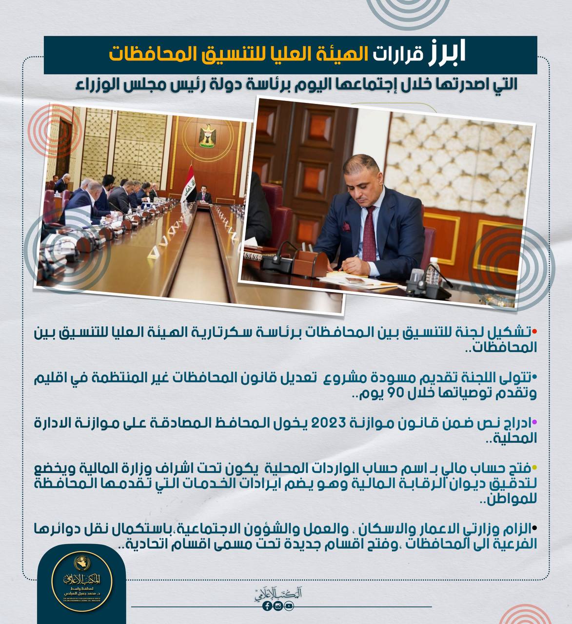ابرز قرارات الهيئة العليا للتنسيق بين المحافظات ، التي اصدرتها خلال إجتماعها اليوم برئاسة دولة رئيس مجلس الوزراء . •تشكيل لجنة للتنسيق بين المحافظات برئاسة سكرتارية الهيئة العليا للتنسيق بين…