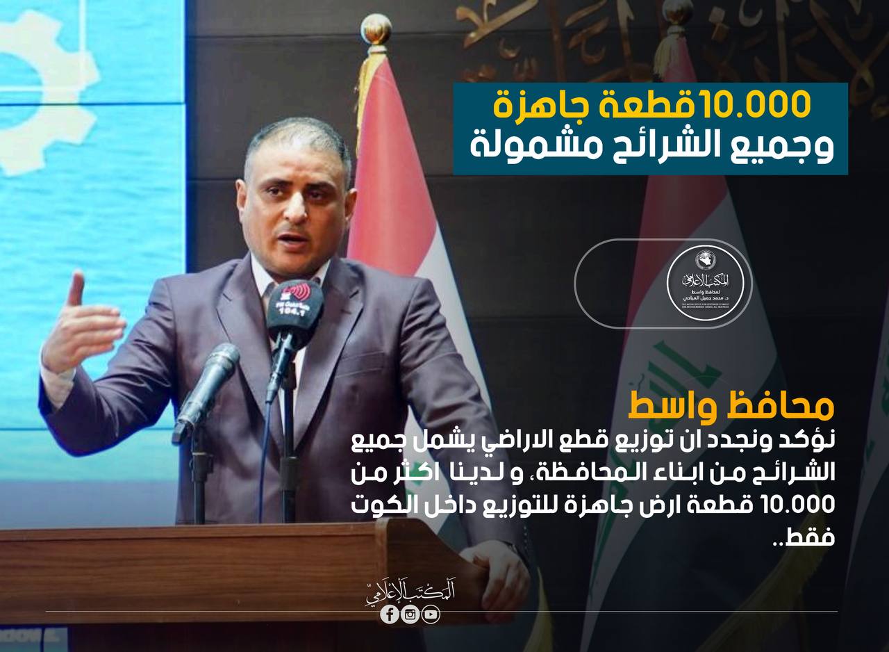 جدد محافظ واسط د محمد جميل المياحي تأكيده على ان توزيع قطع الاراضي يشمل جميع الشرائح من ابناء المحافظة، و اضاف لدينا اكثر من 10.000 قطعة ارض جاهزة للتوزيع داخل…