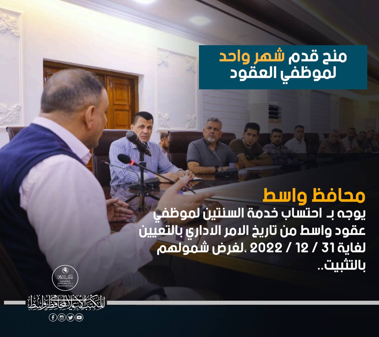 وجه محافظ واسط د.محمد جميل المياحي بـ احتساب خدمة السنتين لموظفي عقود واسط من تاريخ الامر الاداري بالتعيين لغاية ٣١ / ١٢ / ٢٠٢٢ ، لغرض شمولهم بالتثبيت.