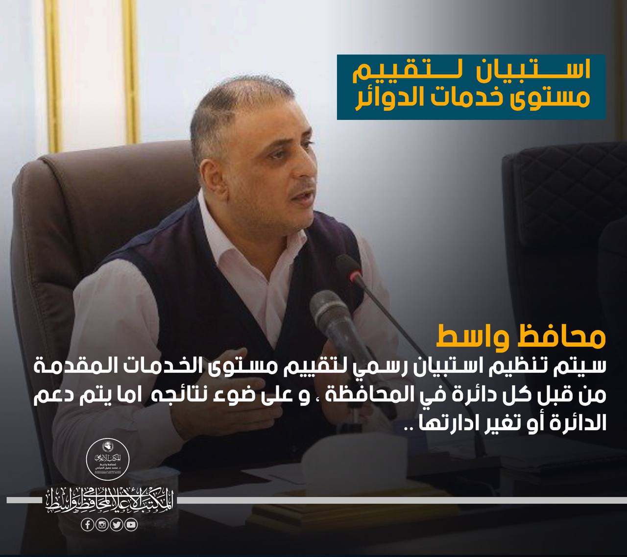 محافظ واسط : سيتم تنظيم استبيان رسمي لتقييم مستوى الخدمات المقدمة من قبل كل دائرة في المحافظة