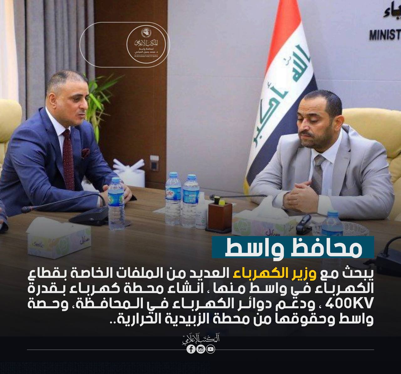 ناقش محافظ واسط د. محمد جميل المياحي مع وزير الكهرباء خلال اجتماع جمع بينهما ناقش العديد من الملفات الخاصة بقطاع الكهرباء في واسط منها ، انشاء محطة كهرباء بقدرة 400KV…