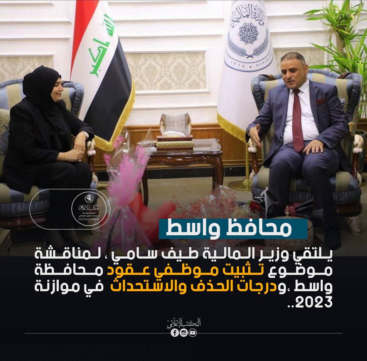 التقى محافظ واسط د.محمد جميل المياحي وزير المالية طيف سامي ، لمناقشة موضوع تثبيت موظفي عقود محافظة واسط ، ودرجات الحذف والاستحداث في موازنة 2023.