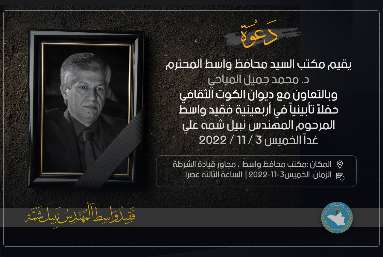 اعلان مكتب السيد محافظ واسط د. محمد جميل المياحي و بالتعاون مع ديوان الكوت الثقافي عن قيام حفلاً تأبينياً في أربعينية فقيد واسط المرحوم المهندس نبيل شمة علي غداً الخميس…