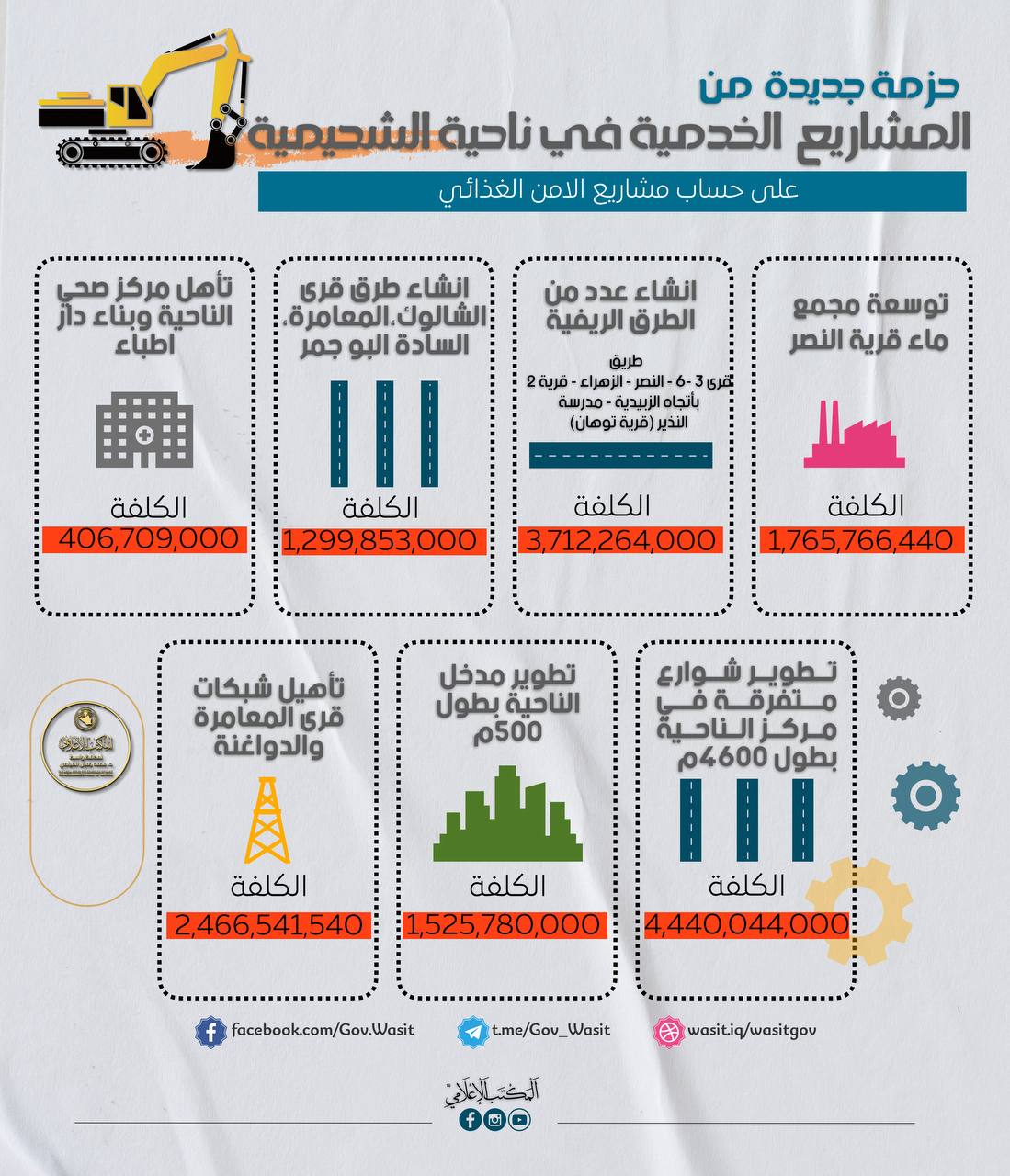 اعلن محافظ واسط د.محمد جميل المياحي عن اطلاق حزمة مشاريع في ناحية الشحيمية بقيمة اجمالية تجاوزت الـ 18 مليار دينار.