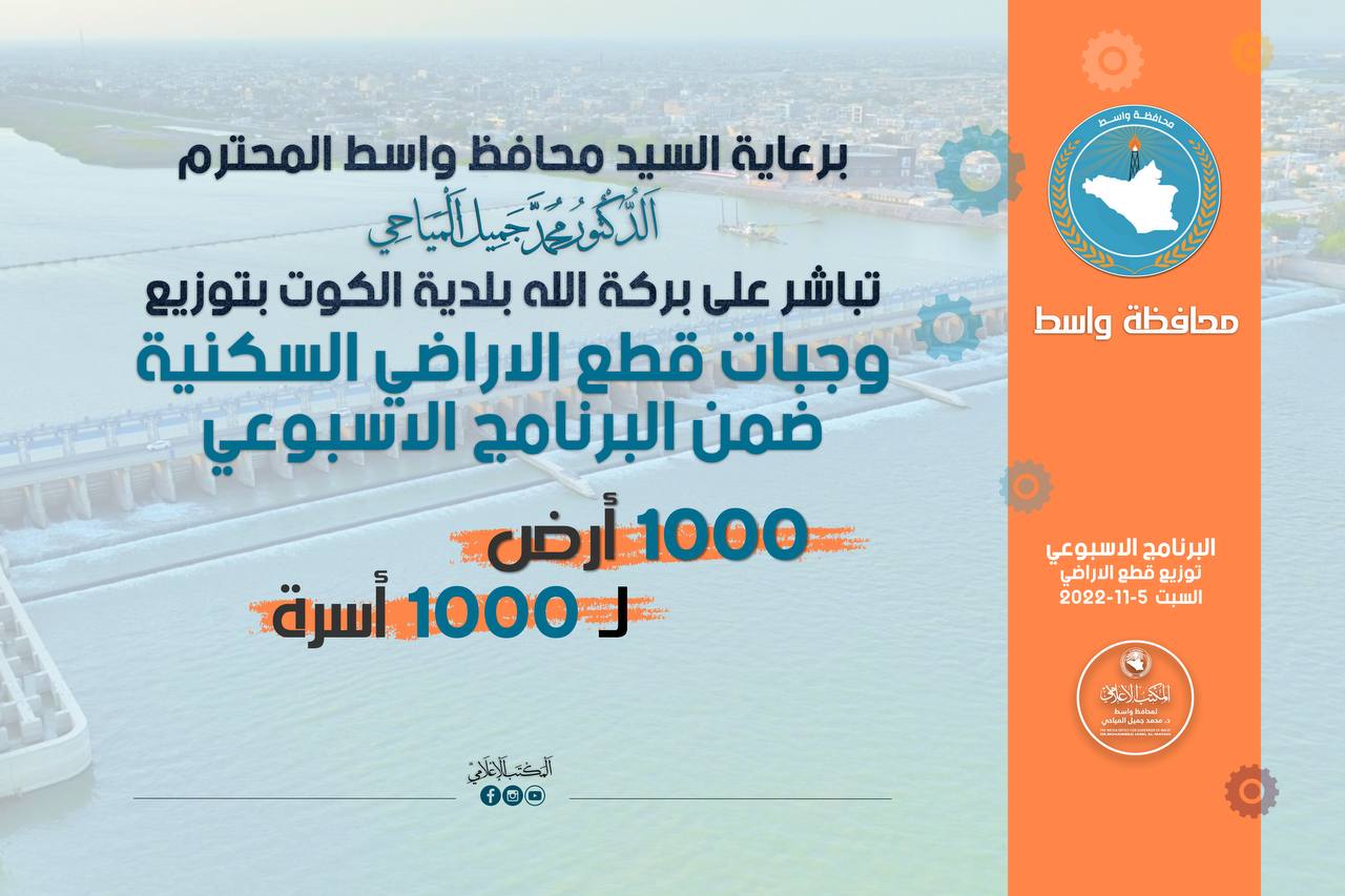 #ألف_أرض لـ #ألف_إسرة كل اسبوع #نذكركم غدا الساعة الـ2 بعد الظهر يباشر السيد محافظ واسط بتوزيع ألف قطعة أرض كل يوم سبت .. ندعو المشمولين بالتوزيع لحضور القرعة العلنية مبارك…