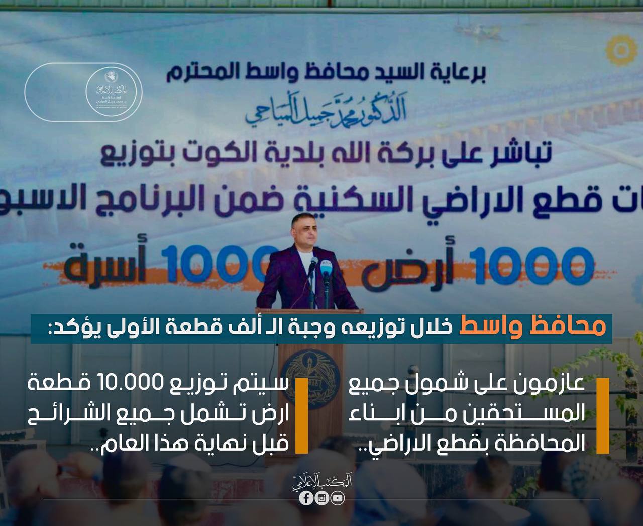 محافظ واسط خلال توزيعه وجبة الـ ألف قطعة الأولى يؤكد: •عازمون على شمول جميع المستحقين من ابناء المحافظة بقطع الاراضي. •سيتم توزيع 10.000 قطعة ارض تشمل جميع الشرائح قبل نهاية…
