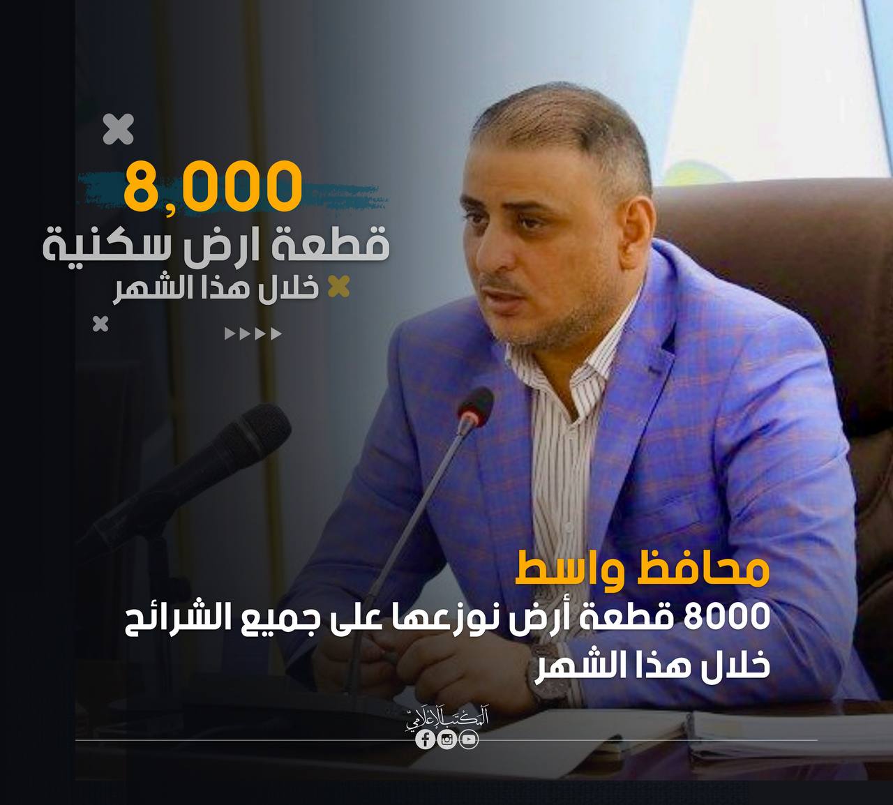 اعلن محافظ واسط الدكتور محمد جميل المياحي عن 8000 قطعة ارض سكنية ستوزع في مدينة الكوت على مستحقيها من مختلف الشرائح خلال شهر تشرين الثاني.