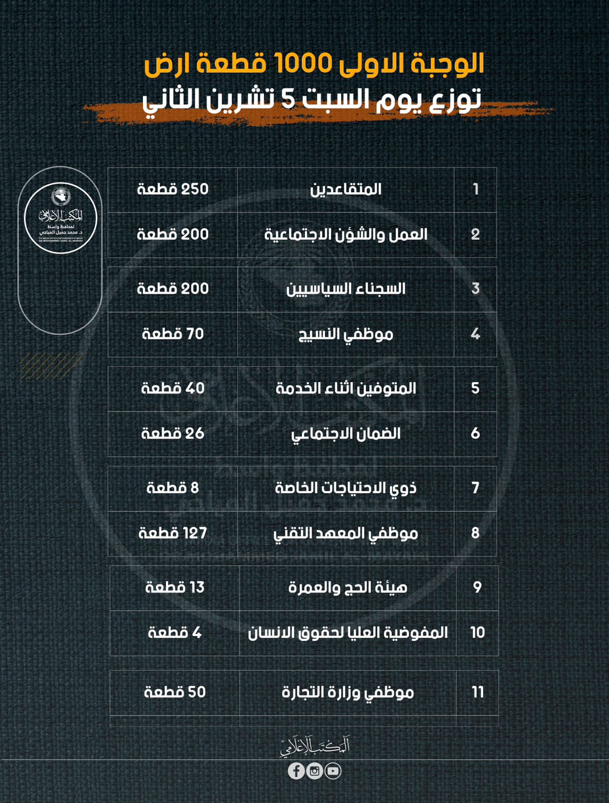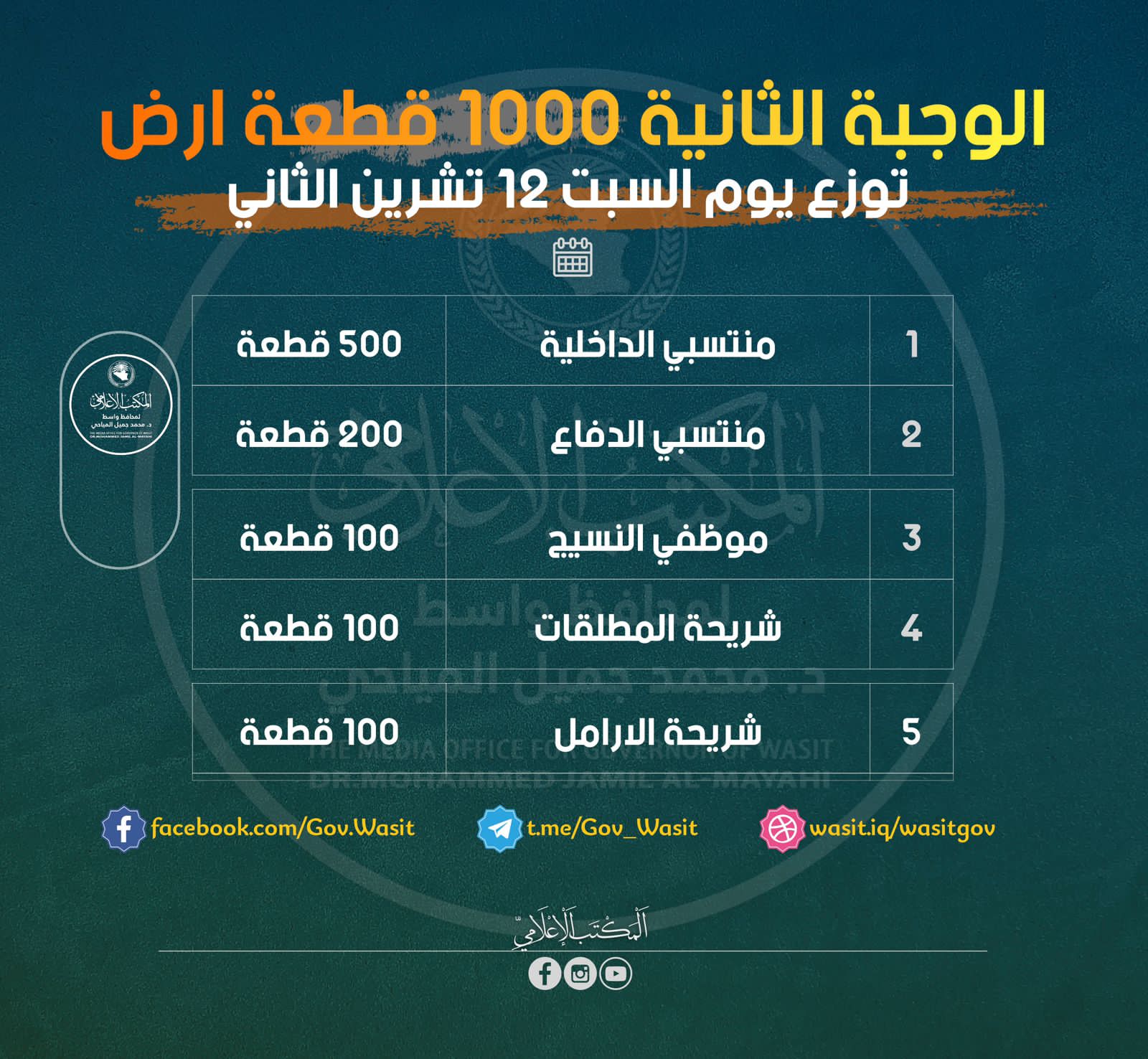 الوجبة الثانية من الـ1000 قطعة أرض اسبوعياً توزع ان شاء الله يوم السبت 12 تشرين الثاني.. حصتها الأكبر للغيارى من أبطال قواتنا الأمنية من الداخلية والدفاع .. وباقي الشرائح الاخرى…