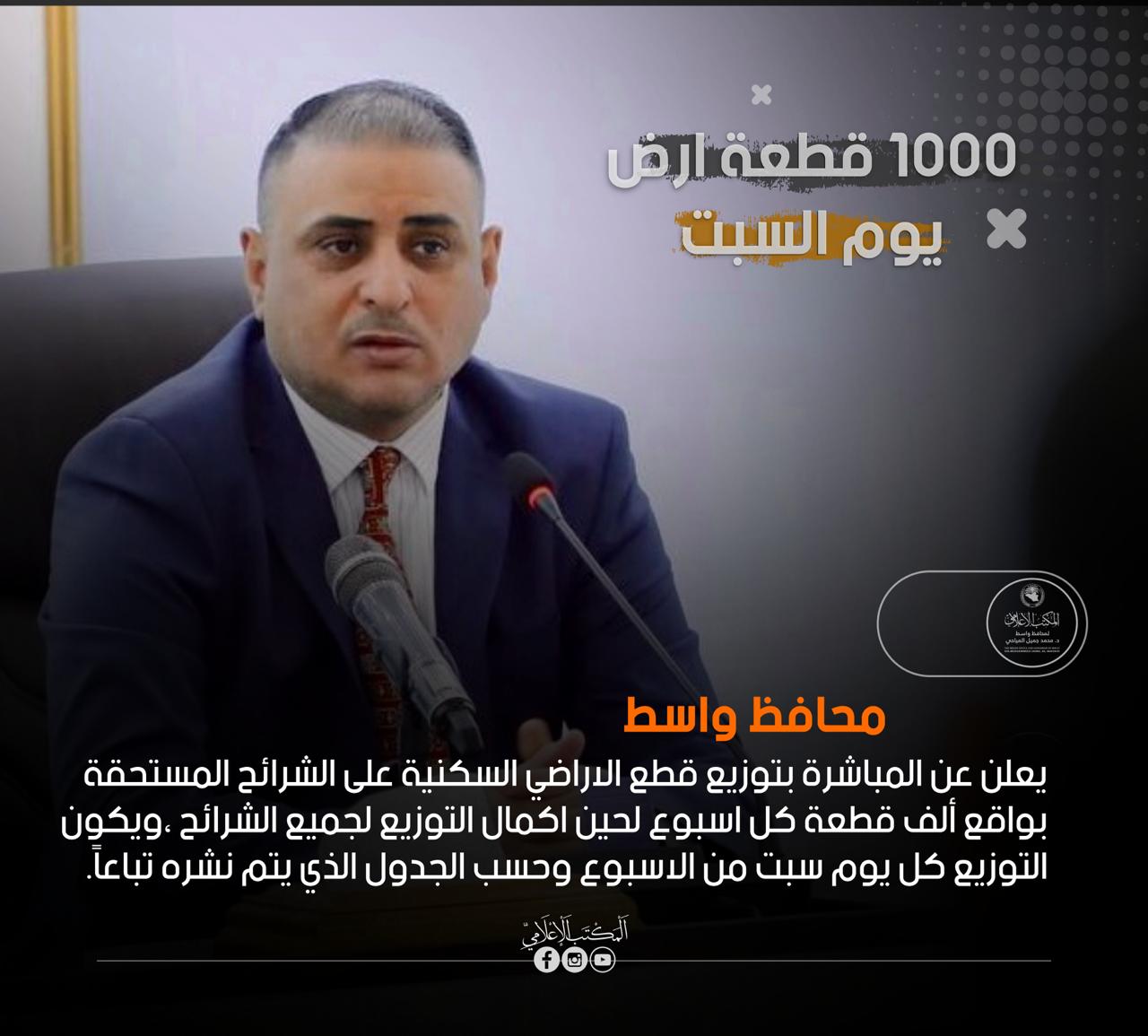 اعلن محافظ واسط د. محمد جميل المياحي عن المباشرة بتوزيع قطع الاراضي السكنية على الشرائح المستحقة بواقع ألف قطة كل اسبوع لحين اكمال التوزيع لجميع الشرائح، و يكون التوزيع كل…