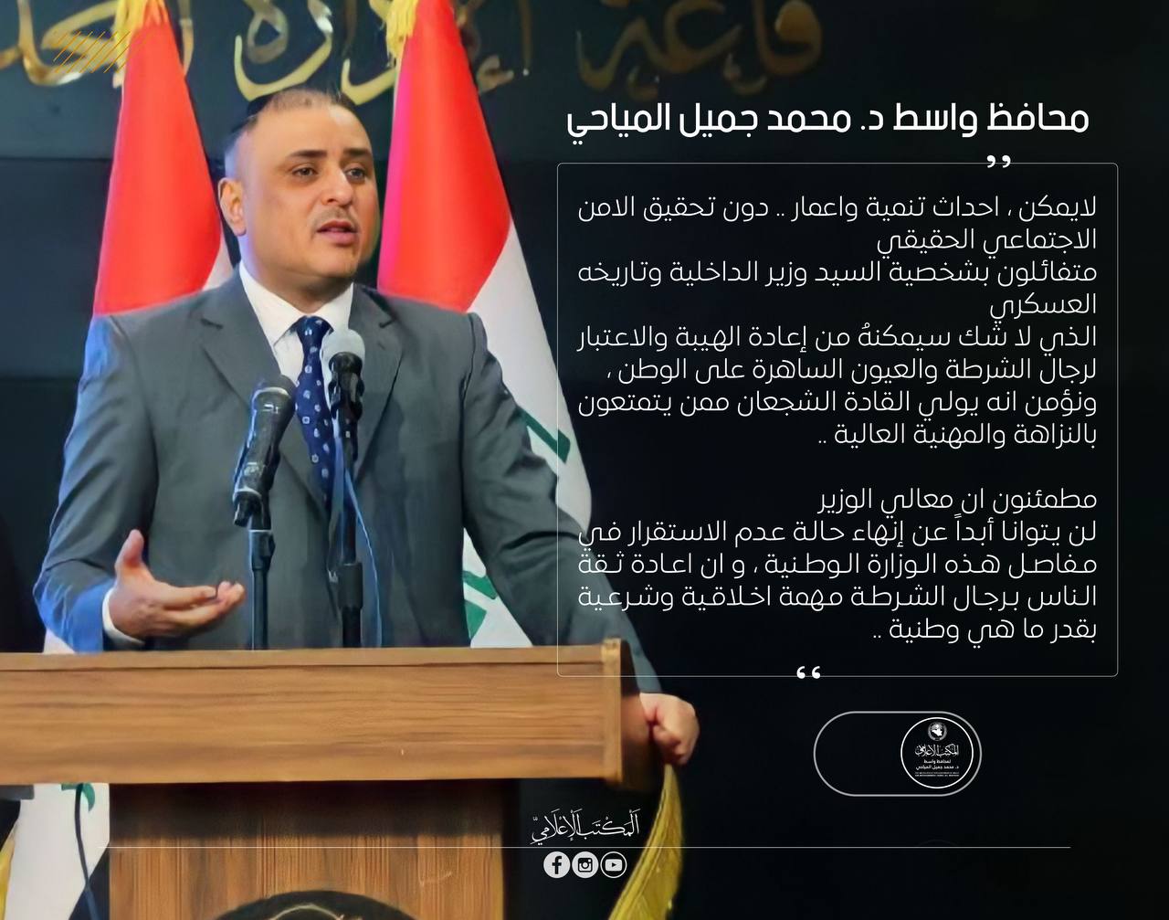 اهم ما اشار اليه محافظ واسط د. محمد جميل المياحي في المؤتمر الذي عقد مؤخراً : 🟢لايمكن احداث تنمية واعمار .. دون تحقيق الأمن الاجتماعي الحقيقي.. 🟢متفائلون بشخصية السيد وزير…