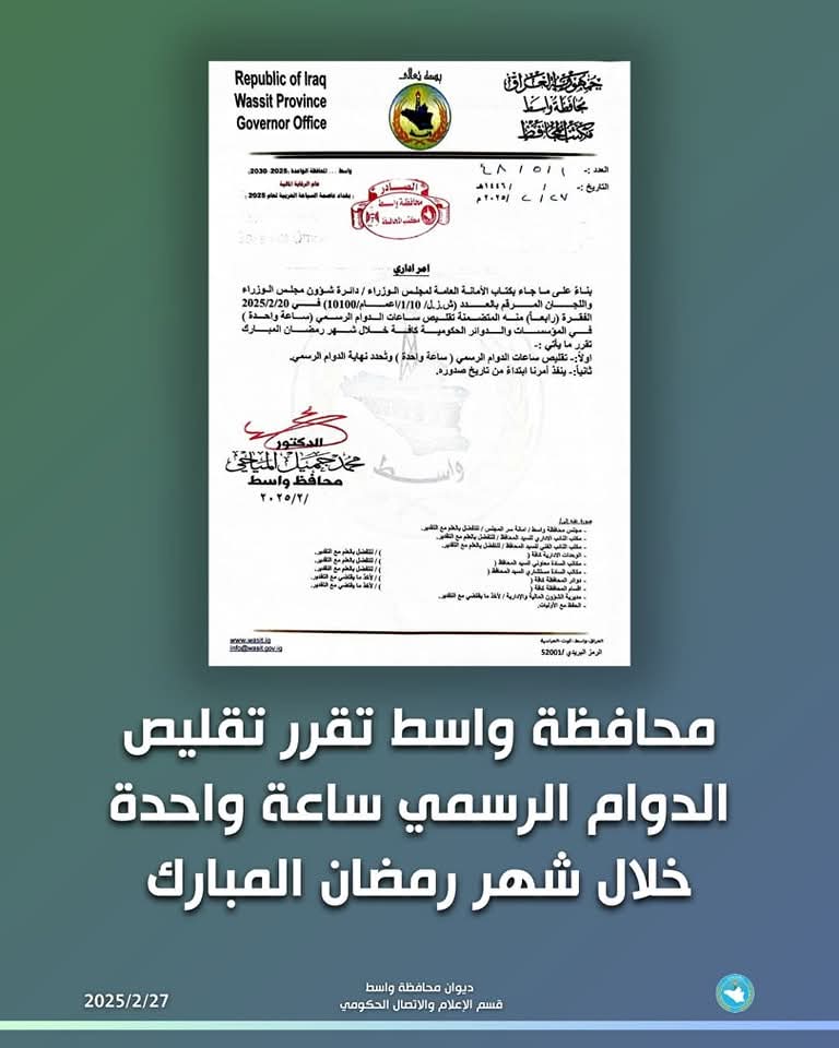 تماشيا مع توجيهات الامانة العامة لمجلس الوزراء قررت محافظة واسط تقليص ساعات الدوام في المؤسسات والدوائر الحكومية كافة (ساعة واحدة ) وتُحددها قبل نهاية الدوام الرسمي وطيلة ايام شهر رمضان…