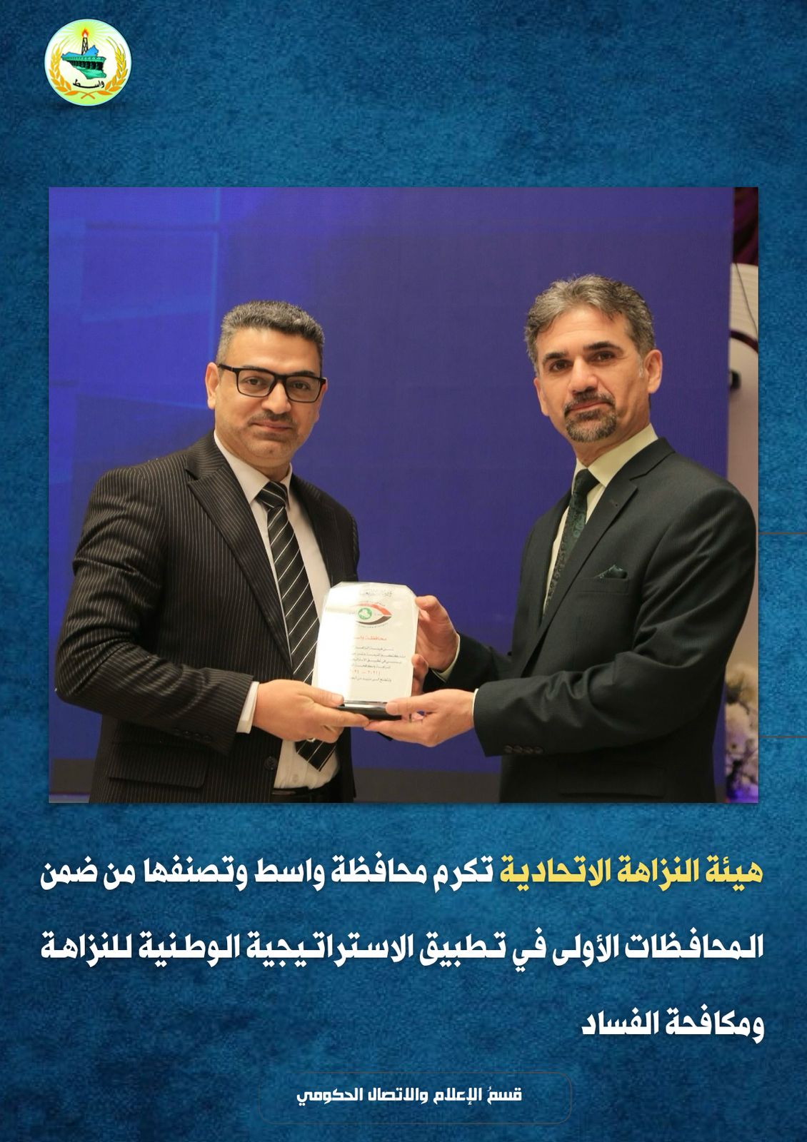 تحرير ومتابعة :رحيم زاير العتابي كرمت هيئة النزاهة الاتحادية محافظة واسط وصنفتها من ضمن المحافظات الأولى في تطبيق الاستراتيجية الوطنية للنزاهة ومكافحة الفساد.