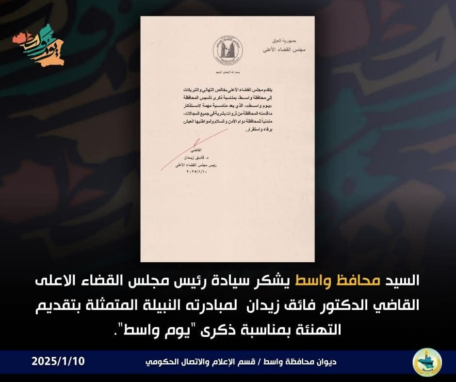 السيد محافظ واسط يشكر سيادة رئيس مجلس القضاء الاعلى القاضي الدكتور فائق زيدان لمبادرته النبيلة المتمثلة بتقديم التهنئة بمناسبة ذكرى “يوم واسط”.