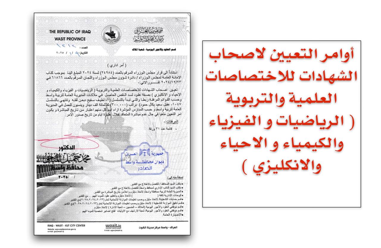 محافظة واسط تُصدر أمر تعيين أصحاب الشهادات للاختصاصات العلمية والتربوية