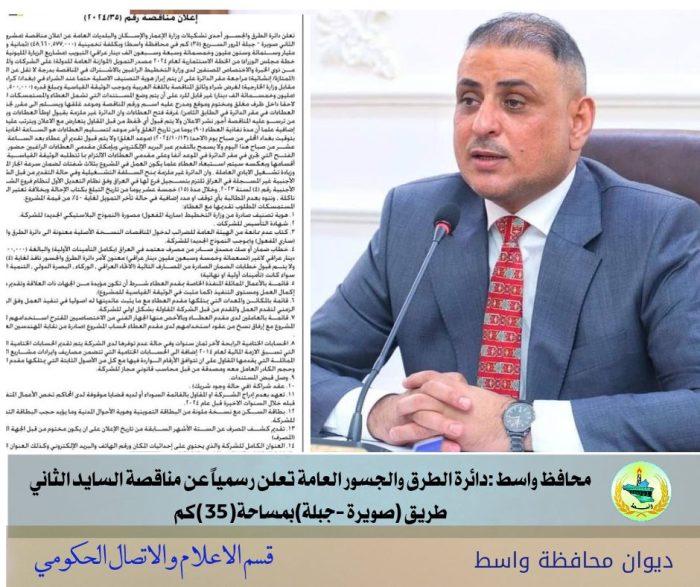 متابعة وتحرير:رحيم زاير العتابي أفاد محافظ واسط الدكتور محمد جميل المياحي بانه دائرة الطرق والجسور التابعة لوزارة الأعمار والإسكان والبلديات العامة أعلنت رسمياً عن مناقصة مشروع السايد الثاني لطريق (صويرة…