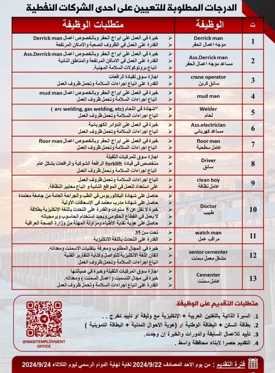 نوهت قائممقامية قضاء إنه وتنفيذاً لتوجيهات السيد محافظ واسط المحترم بخصوص نشر اعلان كافة الدرجات الوظيفية المطلوبة من أجل توفير فرص العمل وعليه نشرت الاعلان الاتي: اعلان: تعلن شركة الواحة…