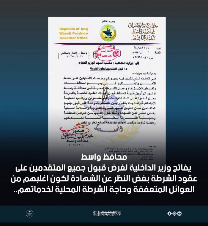 متابعة:رحيم زاير العتابي طالب محافظ واسط د.محمد جميل المياحي وزير الداخلية خلال مخاطبة رسمية بالموافقة على قبول جميع المتقدمين للتعيين ضمن عقود سلك الشرطة بغض النظر عن إعتماد شرط الحصول…