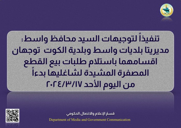 بحسب توجيهات السيد محافظ واسط وجهت مديريتا بلديات واسط وبلدية لكوت المؤسسات والاقسام البلدية التابعة لهما بإستلام طلبات أصحاب القطع ( المُصفرة ) المُشيد عليها دور سكنية التي تعود ملكيتها…