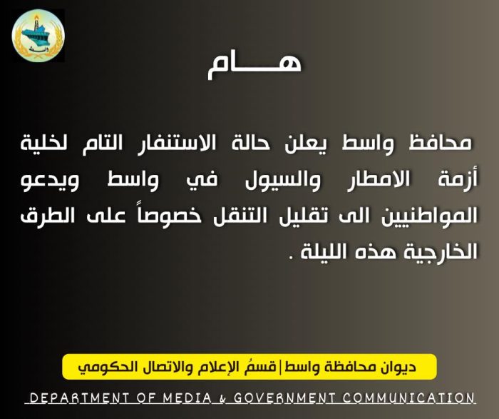 محافظ واسط يعلن حالة الاستنفار التام لخلية ازمة الامطار والسيول في المحافظة بأثر التغييرات الجوية بهذه الليلة