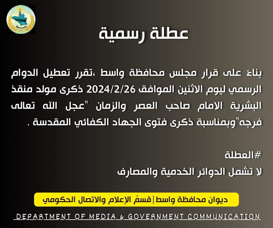 بناءً على قرار مجلس محافظة واسطتقرر تعطيل الدوام الرسمي ليوم الاثنين الموافق 2024/2/26 ذكرى مولد منقذ البشرية الامام صاحب العصر والزمان “عجل الله تعالى فرجه”وبمناسبة ذكرى فتوى الجهاد الكفائي المقدسة…