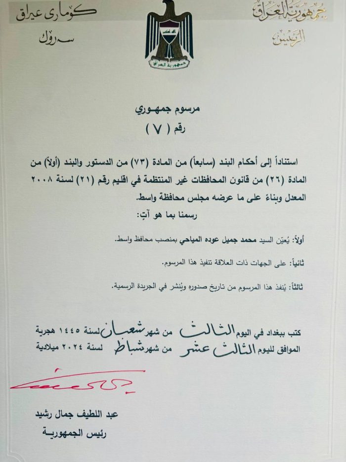 هام: سلم فخامة رئيس الجمهورية للسيد محافظ واسط الدكتور محمد جميل المياحي المرسوم الجمهوري الخاص بتعيينه محافظاً لواسط.